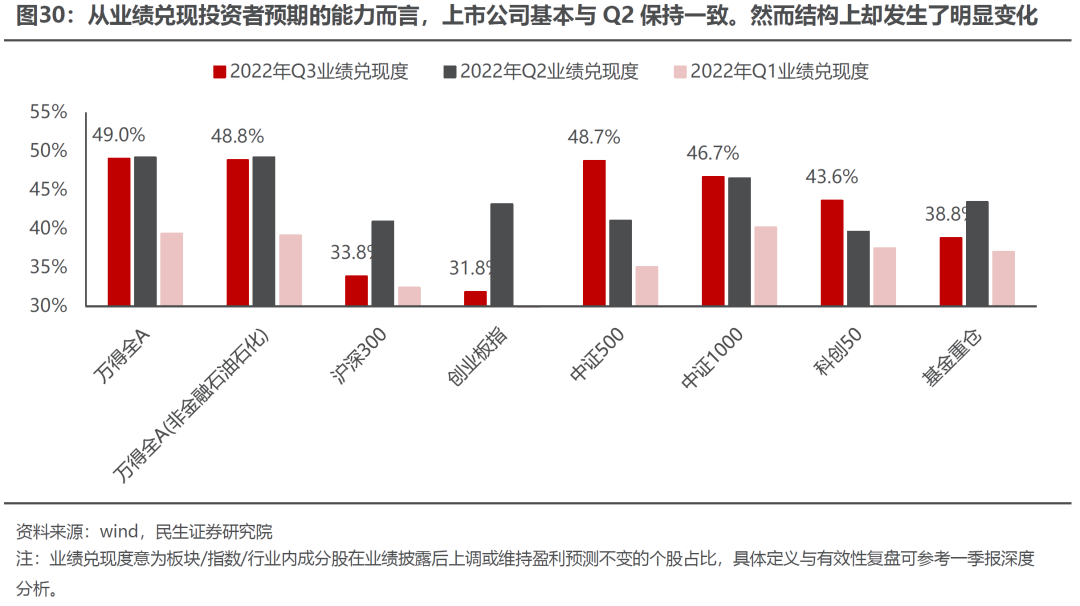 我们沿用中报的分析框架,构建上市公司三季报的业绩兑现度指标来衡量三季报中所体现的各个行业与宽基指数的业绩兑现能力。对于全部A股而言,2022年Q3的业绩兑现度相较Q2变化并不明显,即使剔除金融与石油石化后略下滑0.4%,这意味着从业绩兑现投资者预期的能力而言,上市公司基本与Q2保持一致。然而结构上却发生了明显变化:受经济持续下行的压力影响,沪深300在2022年Q3的业绩兑现度仅为33.8%,相较Q2显著下降,这似乎意味着投资者预期中的龙头股业绩韧性逐渐受到挑战;而对于创业板指而言,尽管业绩表现出色,然后并没有像Q2那般“出人意料”的改善,反而业绩兑现能力明显下滑;相较而言,中证500、中证1000尽管业绩表现依然低迷,然而其业绩兑现投资者预期的能力却在逐季提升,这或许一定程度上能解释为何中小盘在业绩表现不佳,指数表现反而相对占优:在龙头企业在经济持续下行的压力下也开始逐渐面临失速风险之际,中小盘股反而没有投资者预期的那般“差”,即市场正在对中小盘股的过低预期进行修正。然而乐观因素同样有所孕育:科创50的业绩兑现能力同样连续三个季度实现抬升,其业绩表现超预期的“好”意味着新兴产业的发展动能仍然强劲。