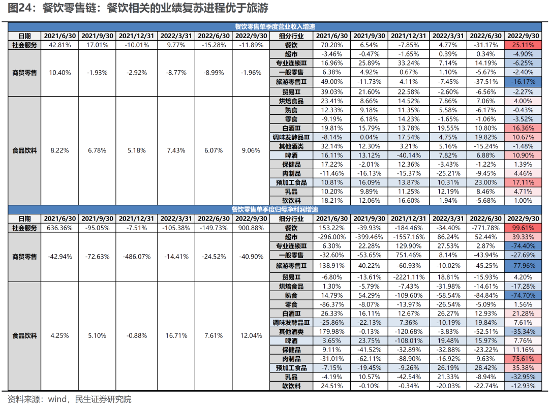 2.4 餐饮零售:餐饮零售业绩不佳,食饮链表现相对占优在餐饮零售链上,餐饮相关的业绩复苏进程优于旅游。餐饮板块2022年Q3的单季度营收与利润增速分别为25.11%/99.61%;食品饮料板块则分别为9.06%与12.04%,相较于Q2均有不同程度的抬升,细分环节来看,白酒、预制品与肉制品的利润增速分别为21.28%、75.61%与35.38%,景气度相对领先。而从毛利率视角来看,多数细分板块毛利率仍处于连续下滑趋势中,成本压力尚未得到明显缓解。相较之下,传统零售链的营收负增长程度在Q3得到一定收敛(从Q2的-8.99%收敛至Q3的-1.96%),然而利润增速进一步下滑,景气度依然低迷。![]()