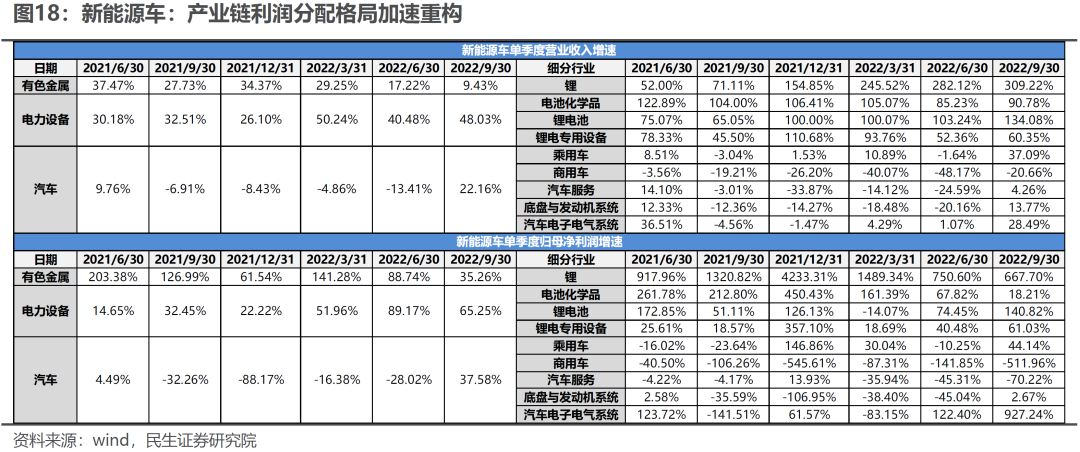 在高端制造产业链中,我们主要跟踪汽车(主要为新能源车产业链)、新型能源系统(主要为光伏、风电、储能、电网建设等)、国防军工的业绩情况。我们曾在此前多篇报告中提到,在锂电产业链中,随着中游锂电材料产能的释放,部分环节价格出现明显的下跌,产业链利润面临重新分配的格局,在2022年Q3,这一现象变得更为明显:从营收端来看,锂电产业链各个环节单季度营收增速相较Q2均实现了边际抬升(上游金属锂/中游电池化学品/下游锂电池营收增速分别为309.22%/90.78%/134.08%),表明下游需求依然旺盛,然而从利润端来看,锂电化学品在2022年Q3的单季度利润增速仅为18.21%,相较Q2的67.82%出现了明显下滑,而上游金属锂与下游锂电池则分别为667.7%与140.82%,依然处于高增长区间。而从销售毛利率与ROE视角来看,锂电化学品相较Q2同样出现边际下滑,而无论是金属锂、锂电池或是锂电设备均在抬升。而在新能源车产业链的其他环节中,无论是整车制造或是汽车零部件环节,Q3业绩表现相较Q2均得到显著改善,其中汽车电子电气系统在2022年Q3营收与利润增速分别为28.49%与927.24%,相较Q2均得到大幅抬升。![]()