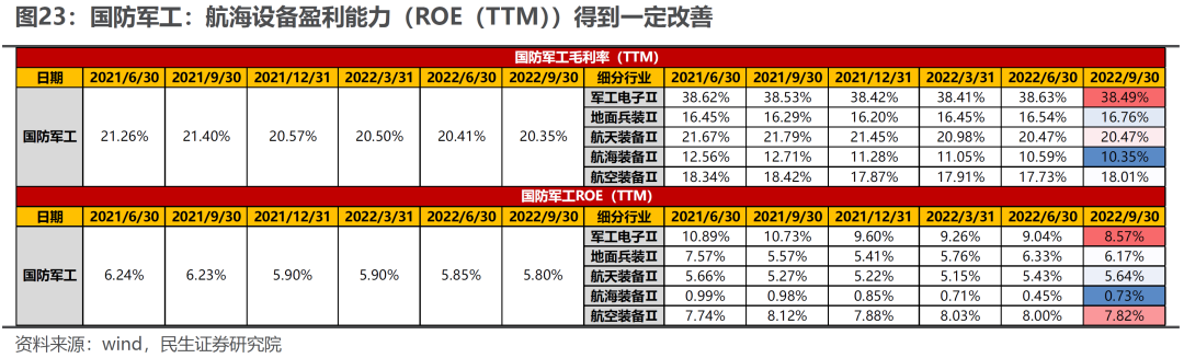 而对于国防军工板块而言,2022年Q3业绩表现分化依然严重。相较之下,航海装备无论从营收增速视角或是利润增速视角改善相对明显,分别从-18.13%抬升至31.23%,-195.29%抬升至147.35%。![]()