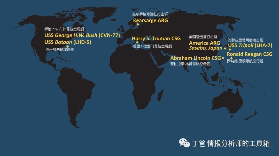 2022年7月7日,美国航母和远征战斗舰队部署位置: