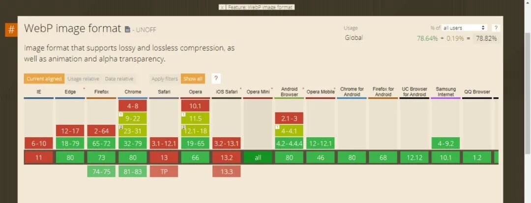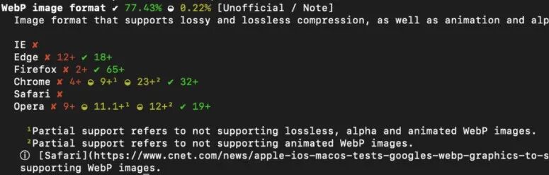 CanIUse 还可以在命令行下使用,例如,在命令行下查看 WebP 图像格式的浏览器兼容性:caniuse webp(运行命令前需要事先通过 npm install -g caniuse-cmd安装命令行工具。