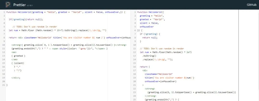 Prettier 是一个代码格式化工具,支持格式化 JavaScript 代码(包括 ES2017、JSX、Angular、Vue、Flow、TypeScript 等)。Prettier 会移除代码原本的样式,替换为遵循最佳实践的标准化、一致的样式。IDE 大多支持 Prettier 工具,不过 Prettier 也有在线版本,让你可以在浏览器里格式化代码。