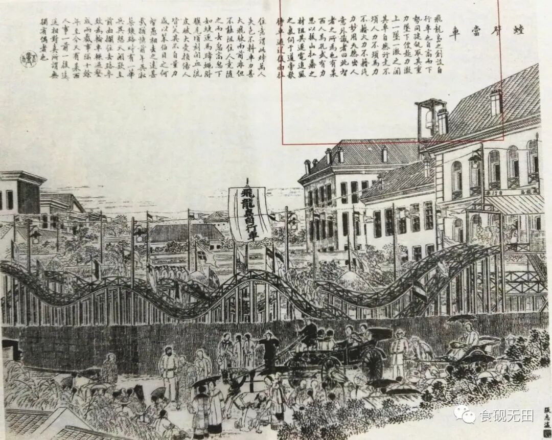 1890年,西人游艺公司(英人麦士尼创办)租虹口三角地建立游艺场,其中“过山车”因形似飞龙而称之“飞龙岛”,轰动上海滩(图321)。"飞龙岛"开张伊始,麦士尼力邀时任《申报》主编何桂笙(1841-1894年,名镛,字行,别署高昌寒食生)前往免费游玩,且亲自陪玩。何主编游玩之后,遂发一篇《飞龙岛游记》于《申报》头版,为"飞龙岛"免费作一大广告。且看游记节录:
