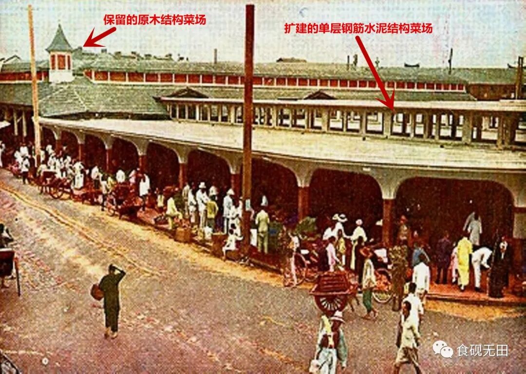 图325:民初(约1916年),汉璧礼路吴淞路口东望第二代虹口菜场(原木结构菜场与新建单层水泥菜场并存,红箭头所示)