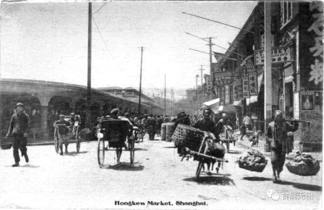 图324:民初(约1916年),文监师路(塘沽路)吴淞路口东望,左侧近处为第二代虹口菜场(原木结构菜场与新建单层水泥菜场并存)