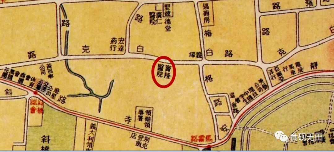 1900年,宝隆医师因悯怜沪上新闸一带贫苦华人每患疾病无处就医,故在白克路(图457-3)创办一所慈善医院,免费收治中国穷人,名“同济医院”(Hospital,Tung Chee for Chinese)。医院初期只有几座从德国军方购买的白铁皮房子,十分简陋。之后,用中德人士的捐款建起一座红砖建筑。在该院看病,租界内的穷苦华人可享受免费治疗,而德国公司的中方雇员看病则需要支付费用。1909年,宝隆医师因患尿毒症英年早逝。同济医院遂将医院英文名更改为Paulun Hospital,以志纪念。1926年,宝隆医院投资十六万余两,聘请沪上著名建筑师乌达克打样监督,在白克路原址沿街建成楼高六层之新院舍(图457-1)。且看《申报》(1926-07-28,第14版)报道如下: