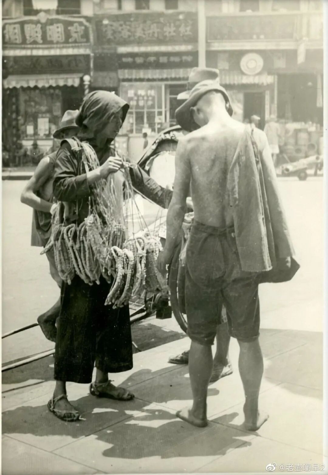 图460为武定路淮安路丁字路口东望,路口一草鞋小贩正在向一光脚黄包车夫兜售草鞋。淮安路东侧街面有克明照相馆(淮安路70号)、红牡丹美容室(68号)等商铺。冠以“牡丹”名的理发室有多家,其中名气较有的是1929年开业的西藏路新世界北楼隔壁之白牡丹理发公司,还有一家红牡丹理发厅开在北四川路1513号邢家桥口。