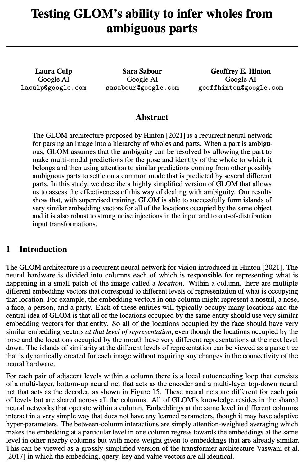 简介:Hinton提出的GLOM架构[2021]是一个递归神经网络,能将图像解析为整体和部分的层次结构,能通过允许部件对其所属整体的姿态和身份进行多模态预测来解决模糊性,利用对来自其他可能模糊的部件的类似预测的关注来确定一个共同模式。本文描述了一个高度简化的GLOM版本,使得能评估其有效性。通过监督训练,GLOM能成功地对同一物体所占据的所有位置形成非常相似的嵌入向量的岛屿,并且还发现它对输入中的强噪声注入和分布外的输入变换具有鲁棒性。