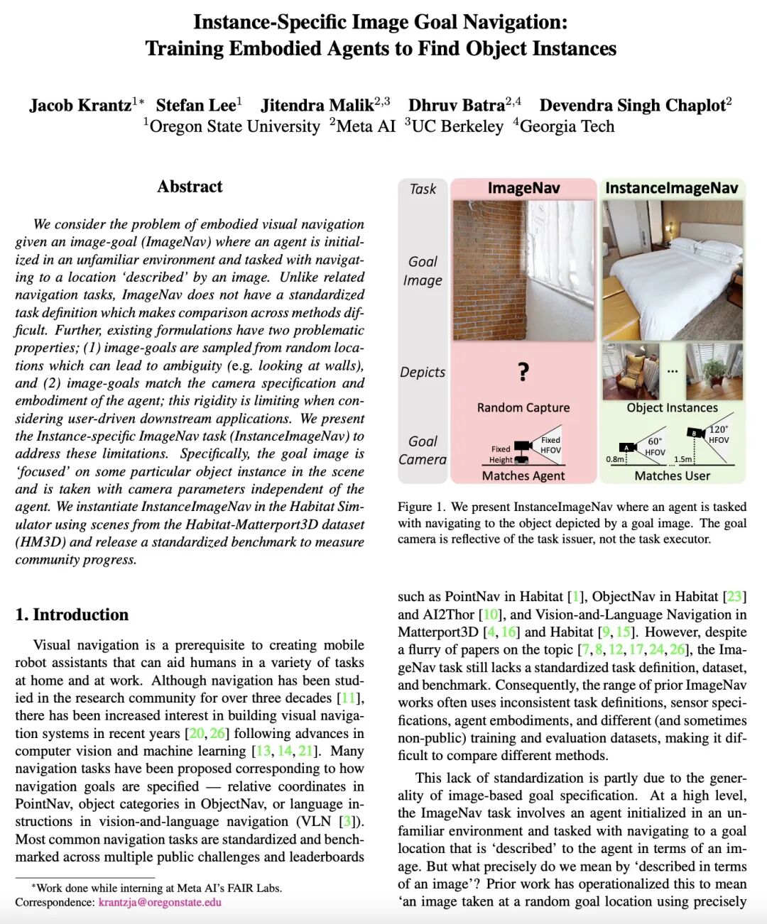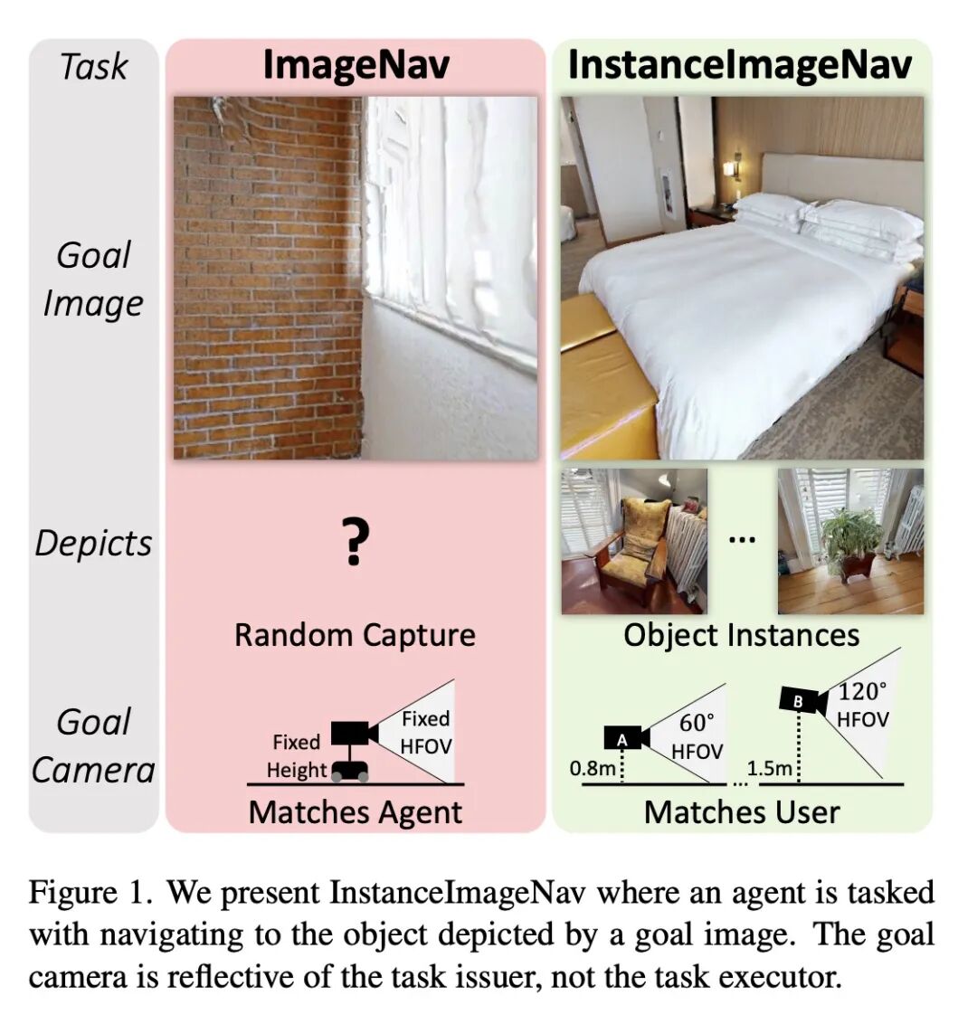 摘要:本文考虑给定图像目标的具身视觉导航(ImageNav)问题,在这个问题上,智能体在一个不熟悉的环境中被初始化,任务是导航到一个由图像"描述"的位置。与相关的导航任务不同,ImageNav没有一个标准化的任务定义,这使得不同的方法难以比较。此外,现有的表述有两个问题:(1) 图像目标是从随机位置取样的,这可能会导致模糊性(例如,看墙),以及 (2) 图像目标与相机规格和智能体的具身相匹配;在考虑用户驱动的下游应用时,这种僵化是有限的。本文提出针对具体实例的图像导航任务(InstanceImageNav)来解决这些限制。具体来说,目标图像被"聚焦"在场景中的某些特定目标实例上,并且是用独立于智能体的相机参数拍摄的。使用Habitat-Matterport3D数据集(HM3D)中的场景在Habitat模拟器中实例化InstanceImageNav,并发布了一个标准化的基准来衡量社区的进展。
