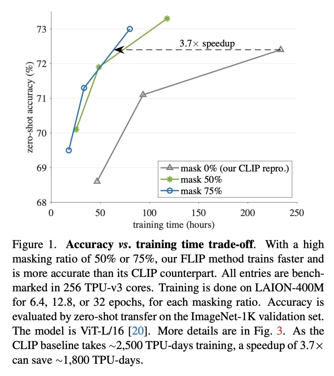 摘要:本文提出快速语言-图像预训练(FLIP),一种简单且有效的训练CLIP的方法。该方法在训练过程中随机掩码并删除了一大部分的图块。掩码使得能在相同的挂壁时间内从更多的图像-文本对中学习,并且在类似的内存占用下,每次迭代对比更多的样本,带来了准确性和训练时间之间的有利权衡。在对4亿个图像-文本对的实验中,FLIP比非掩码基线提高了精度和速度。在大量的下游任务中,FLIP的表现主要优于在相同数据上训练的CLIP对应模型。在速度提升的推动下,本文探索了增加模型大小、数据大小或训练长度的扩展行为,并报告了令人鼓舞的结果和比较。希望本文工作将促进未来对视觉语言学习的扩展的研究。