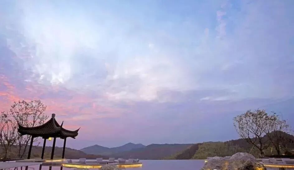 从酒店大堂眺望出去,夕阳落下时将天空染成梦幻的紫色,在隐世的天台山中倒不显突兀。一个人站在亭下远望的背影,就是要将画面的孤独感发挥到极致!
