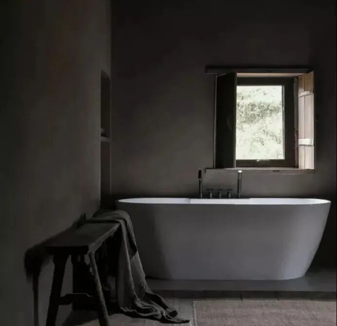 民宿的孤独感还体现在它贯穿整栋建筑的侘寂风,白色的浴缸在这“暗黑系”里,相对成趣。边泡澡边偷看外面的景色,就让我孤独下去吧。