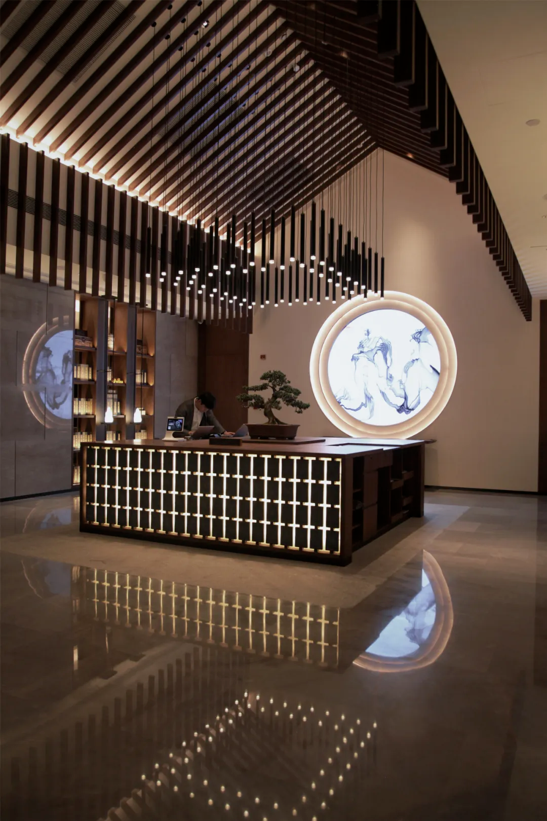 不同于外观的白墙灰瓦般古典,大堂的中式设计带着一丝现代风,“高调”地彰显它的富丽优雅。