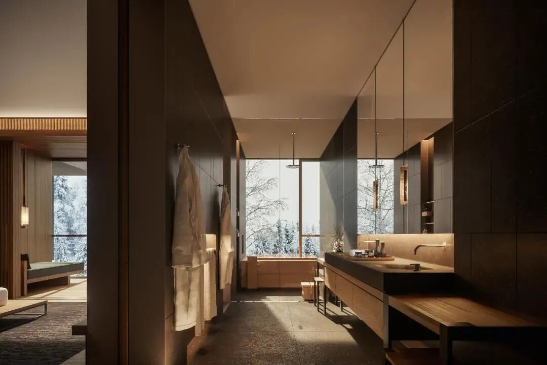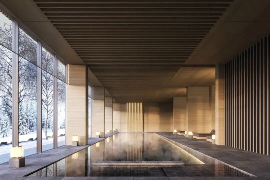 一座25米的室内泳池直面美丽的新雪谷山景,没有多余的装饰,让人可以更好地沉浸在宁静的日本风光。
