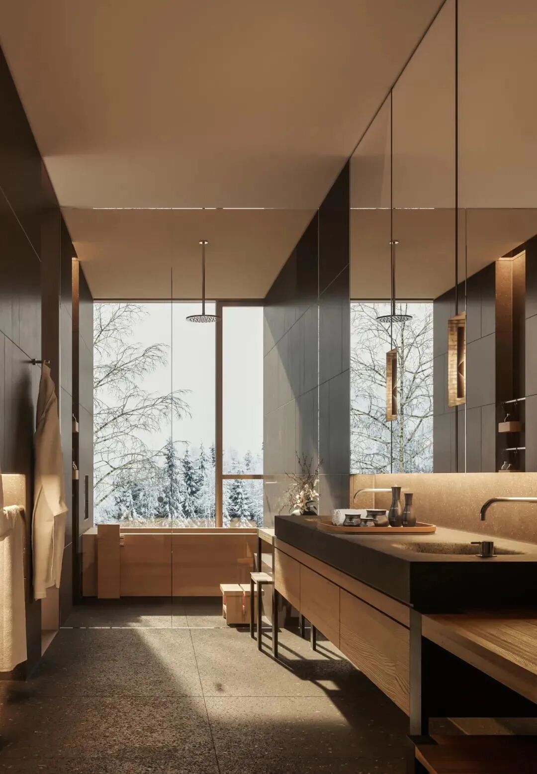 干湿分离的浴室,所有浴缸都是临窗设置,此时泡着澡看着窗外漫天飞舞的雪花,再沏上一壶热茶,温暖身心,真是爱到不行!