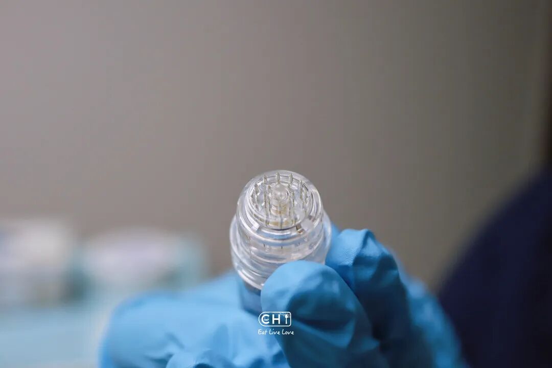 和发丝一样细的24K黄金微针会扎进皮肤表层固定1mm的深度,瓶中的精华会输送至皮肤真皮层。
