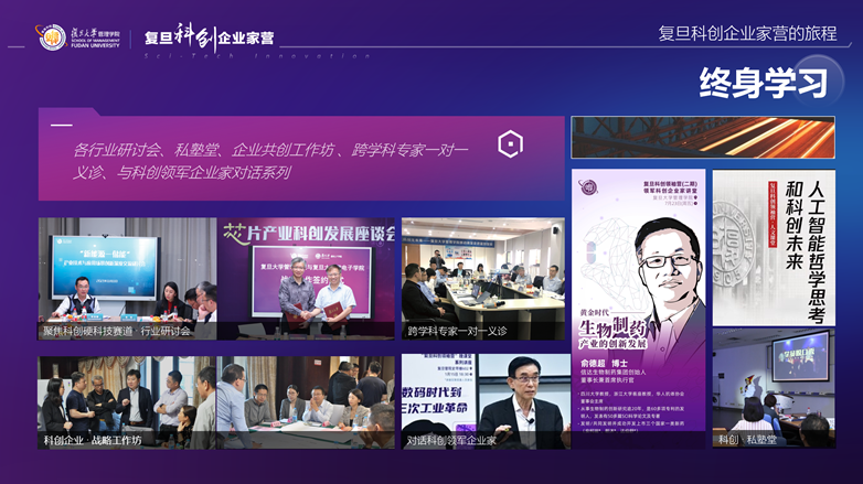 除了基础的课程设置,复旦管院针对科创企业发展不同阶段所面临的不同难题,通过战略工作坊、跨学科一对一企业会诊、私塾课、微咨询等多种产品和服务,组织同学与行业专家、科创领军企业家进行对话和沟通,为科创企业学员提供终身学习的平台,让科创企业学员把管理理论与企业发展实践相结合。