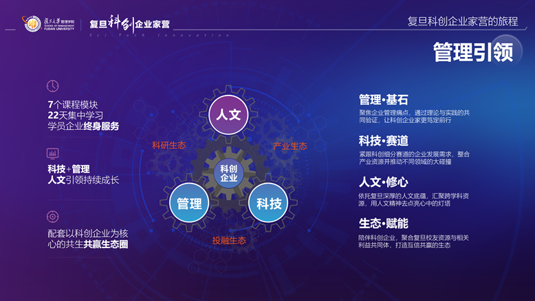 以科创企业发展为核心目标,复旦管院联动核心合作伙伴,整合自身强大的教师、校友资源,发挥复旦的品牌优势,为科创企业学员拓展资源,打通科创企业上下游产业链,打造互赢共生的赋能生态,成就科创企业。