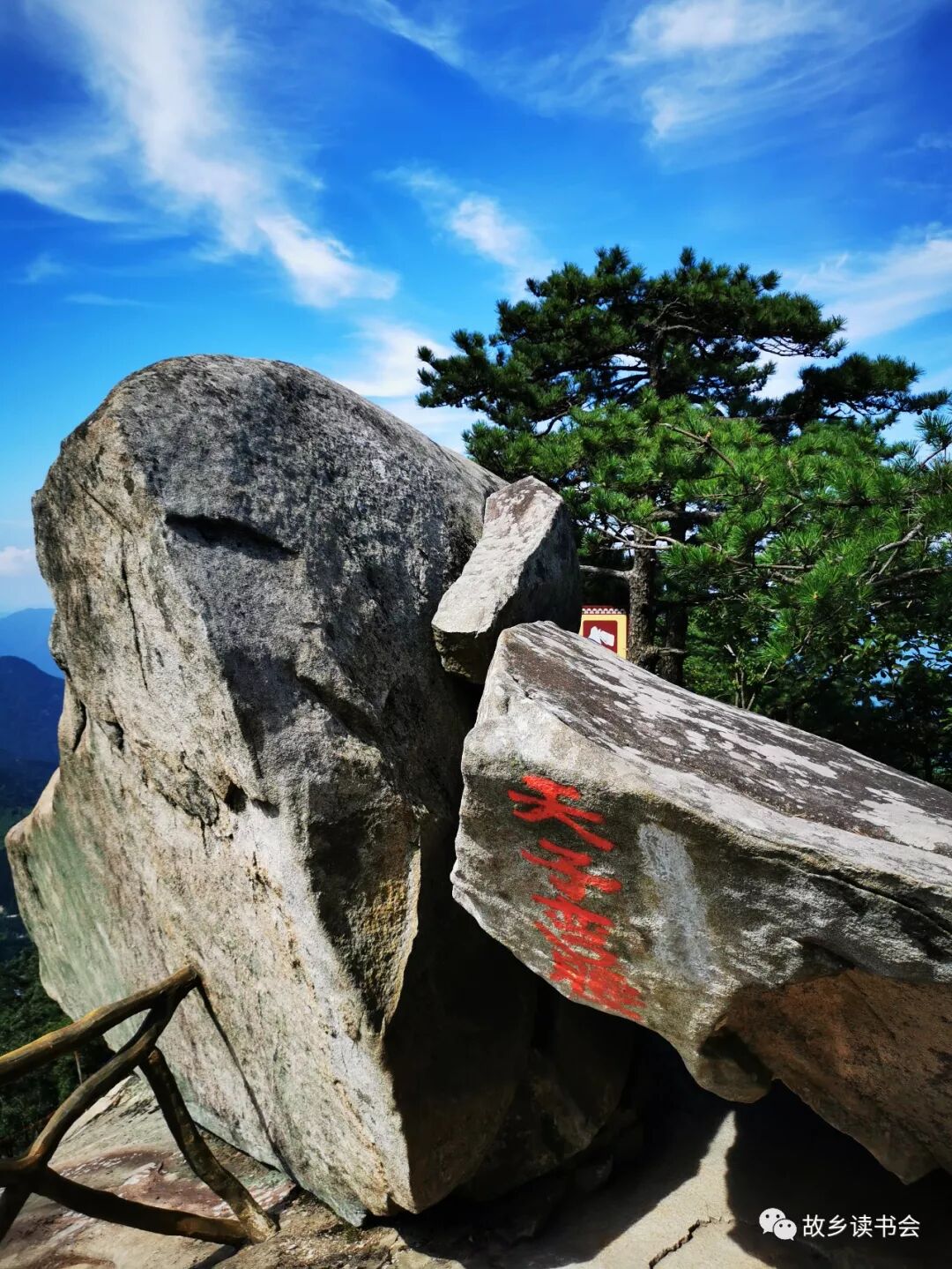 采风第三天,登临罗田薄刀峰。站在锡锅顶上,山风浩荡,红旗飘飘,蓝天白云,山色苍翠,山势如海,无不激荡着一种豪情和逸兴。从锡锅顶下来,高超校长兴奋不已,他竟聊发少年狂,想要跟孩提时一样徒手攀爬一面斜坡。不愧为“重量级人物”,体大身沉的他爬了不到一米就滑下来,一只鞋子也意外跌进了山谷。鞋子就在五六米下的树丛间,清晰可见,下去捡拾上来是完全可行的,但高超校长竟把另外一只鞋子也扔了下去。要知道,那可是一双价值两千元的运动鞋啊!此举让人瞠目结舌,高校长却大笑:“我把鞋子留在故乡,自此故乡有了我更多的牵挂!”我打趣道:“若干年后,此处应竖一个标牌,上书几个大字:‘高超脱履处’!”