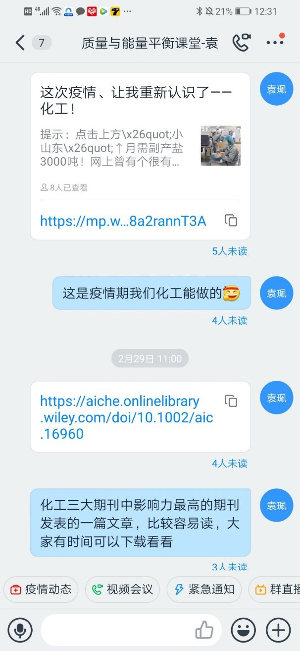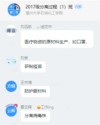 课后袁珮老师还针对学生课上的口罩问题,寻找了相关的信息共享于在线上授课群中,另外还推送了微信链接:“这次疫情,让我重新认识了-化工!”给与学生更多启迪。
