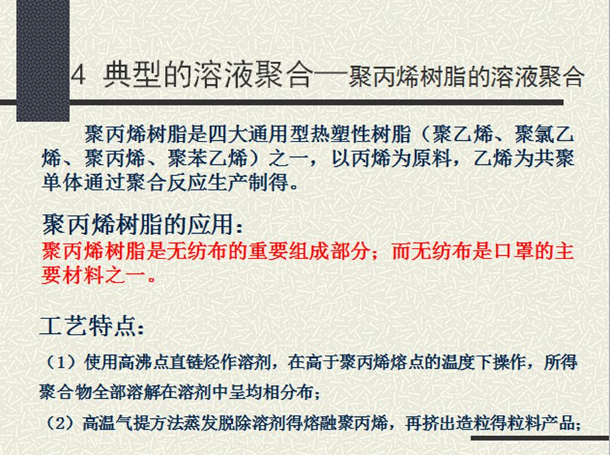 《聚合反应工程基础》主要是讨论化学反应工程、聚合过程工程分析及聚合体系传递过程的基本原理及技术方法的一门课程。该课程紧密结合疫情形势及课程专业背景,对课程内容进行延伸。结合抗击新型冠状病毒2019-nCoV相关产品的生产制备过程,启发学生开展学习和讨论。在抗击疫情初期,国内口罩、防护服、消毒剂等产品面临短缺。结合疫情现状和化工学科的专业特点,普及化工学科在生活中不可或缺的重要地位。