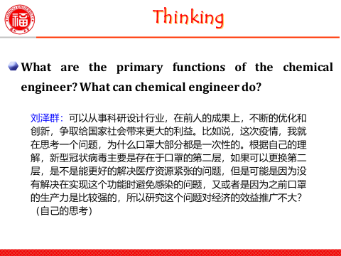 化学工程师能做什么?这是袁珮老师在完成线上授课准备工作的同时布置给学生们的思考问题。学生们对这个问题进行了有针对性的寻找和思考,为第一堂《质量与能量平衡》双语课程做好了充分的课前准备。