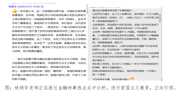 疫情防控时期,林炳华老师通过“金融教育三部曲,课前中后三联动”的线上教学新模式(线上教学采取中国大学Mooc课程视频、福州大学课程中心《金融学》教学平台和QQ群互动交流平台),对《金融学》课程课前、课中、课后教学计划进行精心规划,课程思政,正向引领。