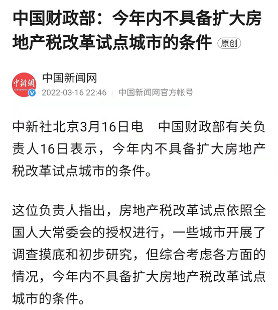 2022年3月16日,财政部明确表示:今年内不具备扩大房地产税改革试点城市的条件。