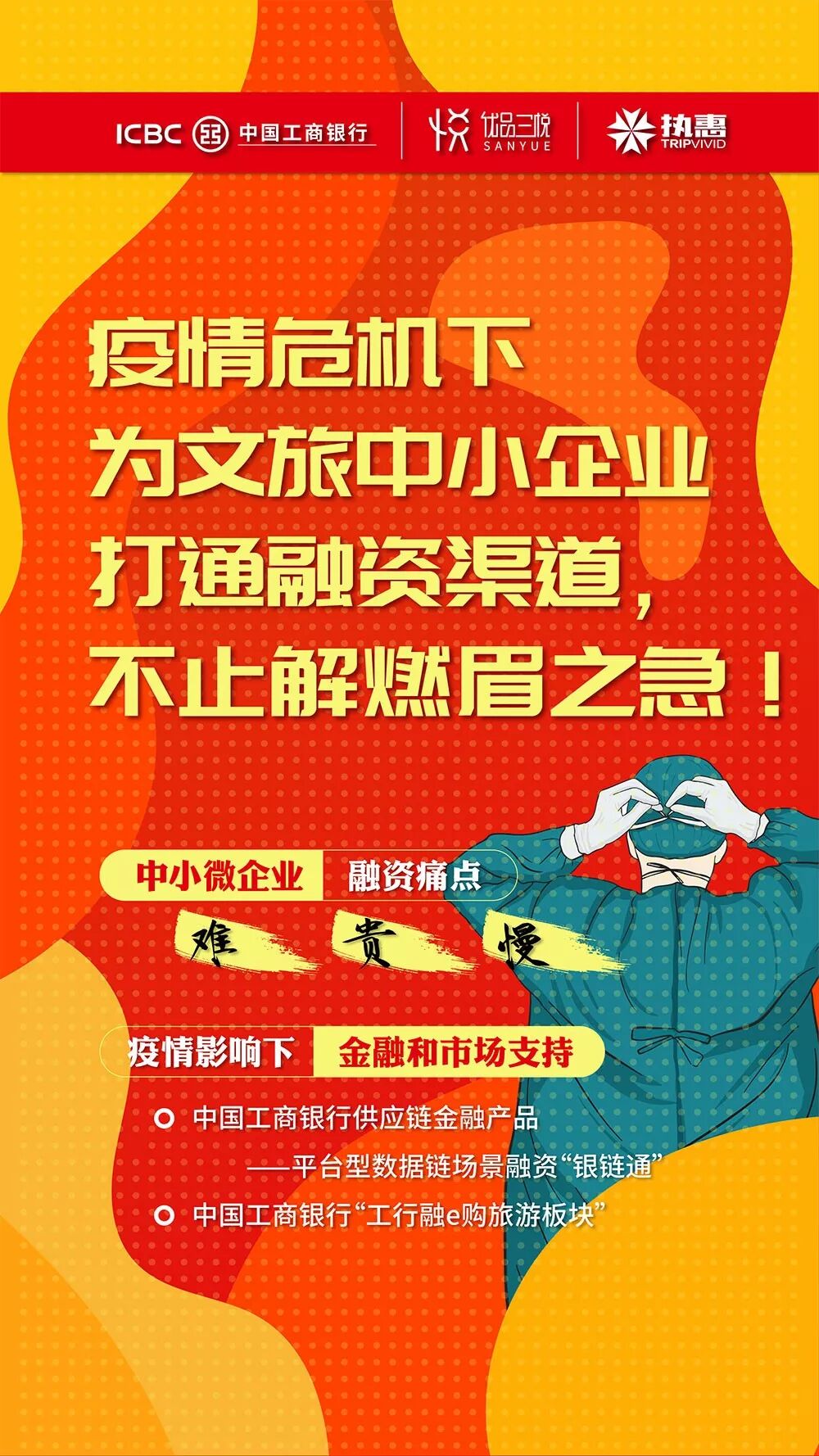 作为全球最大的商业银行、国有第一大商业银行,工行一直在助力中小微企业发展,提供相应的金融支持,为与文旅企业共抗疫情,其推出两款 “平台型数据链场景融资(银链通)”产品:工行e差旅场景融资产品、旅游供应链场景融资产品,针对性解决中小企业融资三大问题:难、贵、慢。