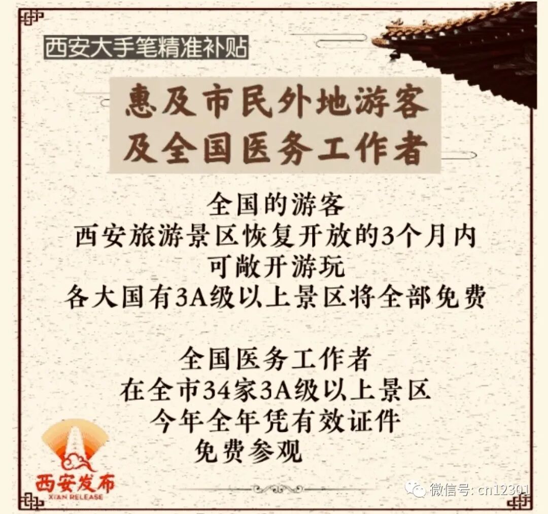 西安的住宿业的同行们可得活动活动心眼,景区门票免费,住宿餐饮可要花钱,提前谋划,和景区组合产品联合营销是个路子。