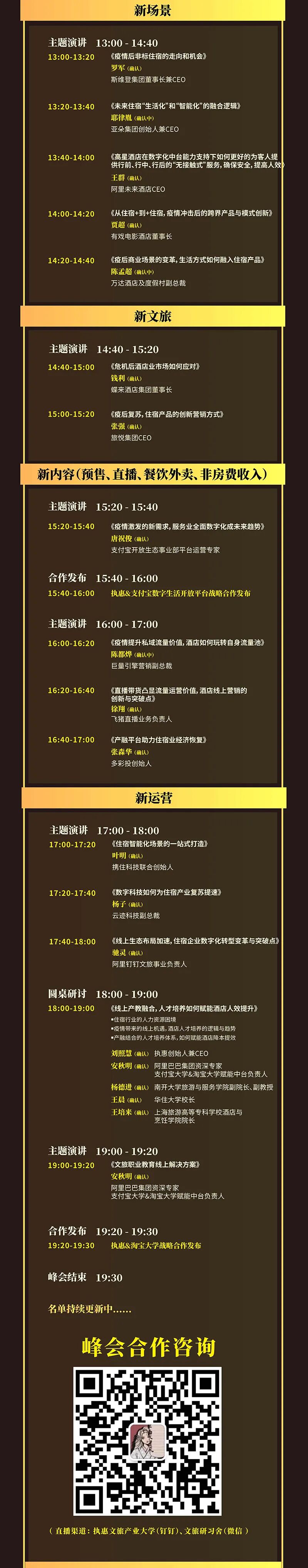 自疫情爆发以来,基于文旅产业大学(钉钉)、文旅研习舍两大传播平台,执惠推出“60期大咖公益直播”系列课程,并于3月12日成功举办“振兴·新生 2020·中国文旅大消费线上公益峰会”,受到学、业界人士广泛好评。此次,执惠将聚集住宿这一细分领域,举办首场大住宿云峰会,探路行业疫后复苏。扫描下方二维码,即可关注最新直播动态!