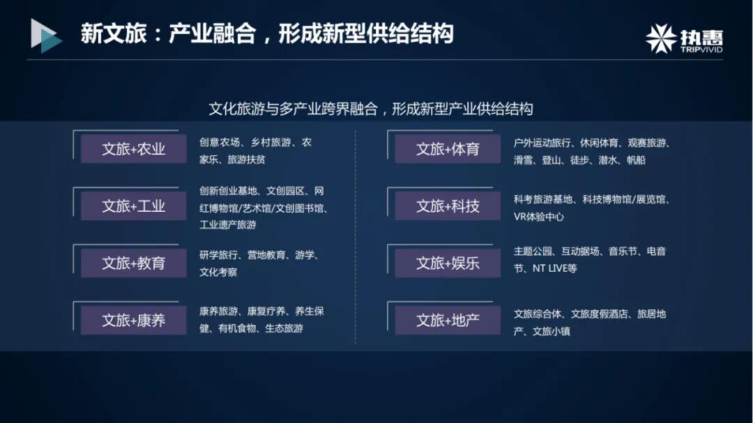我们看到新文旅的融合下,形成新型的产业供给结构,“文旅+农业”、“文旅+工业”、“文旅+教育”、“文旅+康养”、“文旅+体育”、“文旅+科技”、“文旅+娱乐”、“文旅+地产”,我们看到文旅的融合绝不能完全概括文旅各个领域里面新的实践。