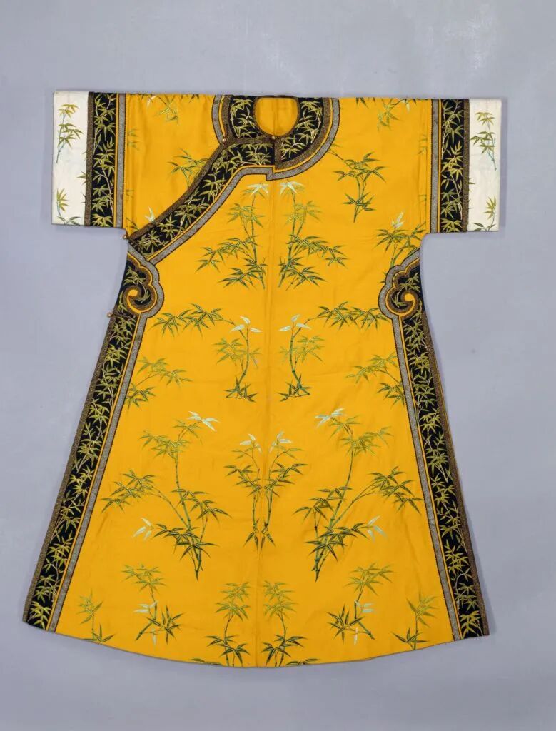 清代档案当中,皇帝夏季常服中也常使用葛纱。其中有专门派织、定制的衣料。如乾隆二十四年(1759年)六月二十一日,总管马国用等人拿出上用兼丝葛纱样一块,并传乾隆帝旨意:“着交织造安宁,每年照此颜色织新花样上好兼丝葛纱二十匹解京成做上服。钦此。”此后数十年间,苏州织造都会在夏季进解皇帝派织的兼丝葛纱衣料。此外杭州织造也有进贡葛纱,如道光二十五年(1845年)规定次年起贡单内增加上用酱色江山万代葛纱袍料二连。也有朝臣进贡的衣料。这些葛纱经由内务府的巧匠之手,变成了皇帝、后妃等人穿用的夏装,档案中不乏相关记载:❖ 明黄实地纱绣绿竹枝女单□衣