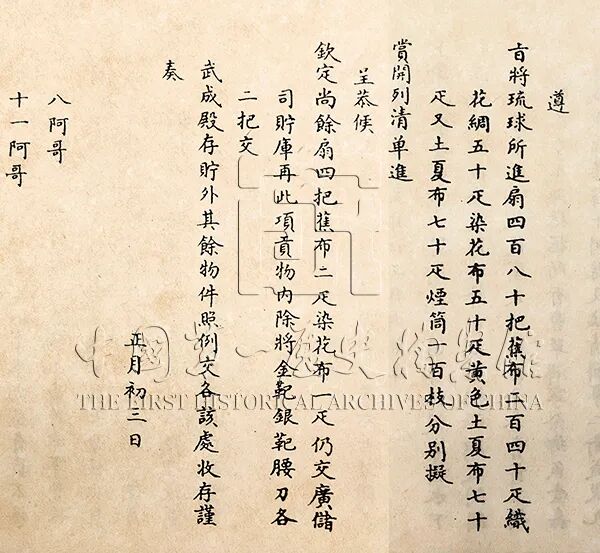 在档案中,琉球蕉布有不同花色,如青花蕉布、白花蕉布、素花蕉布,也有练蕉布、纹蕉布之分,有时还特地加以修饰,称其为“细嫩土蕉布”。其中更有一种写作“淑椒布”,辨其语音语意,可能是“熟蕉布”之误。乾隆初期,内务府广储司曾盘点库存的琉球蕉布,有康熙年间所贡的花蕉布、土蕉布共732匹,雍正朝至乾隆七年5次进贡的各色蕉布690匹,加上土夏布330匹,库贮琉球各色贡布达1752匹。这些布匹皆以天然植物纤维纺织,自康熙朝到此时贮存日久,想来已经不堪应用。因此不久之后,内务府就将这些布匹变卖折价,熟蕉布、花蕉布与土夏布等值,每匹价银2钱;土蕉布则每匹银3钱,想来是因为其工艺尤精,质地更为细嫩的缘故吧。嘉庆、道光年间,不再任由蕉布在库中久贮。这一时期的上谕档中数次记载,清帝将琉球所贡蕉布、土夏布、雅扇等物品按等第分别赏赐给王公大臣。❖ 嘉庆三年赏赐王公大臣琉球国所进蕉布等项物品的上谕或精致、或简约的夏布伴随古人度过了炎炎暑天,正如白居易《夏日闲放》诗所描摹的:“夏服亦无多,蕉纱三五事。资身既给足,长物徒烦费。”无论是宫廷还是市井,人们忘却世俗,心无尘念,便可在这盛夏时节自生清凉。版权声明:本号文章、档案插图、音视频等版权均归“皇史宬”公众号(ID:mingqingdangan)所有,未经授权禁止转载!但欢迎读者朋友们转发分享!