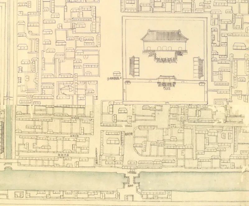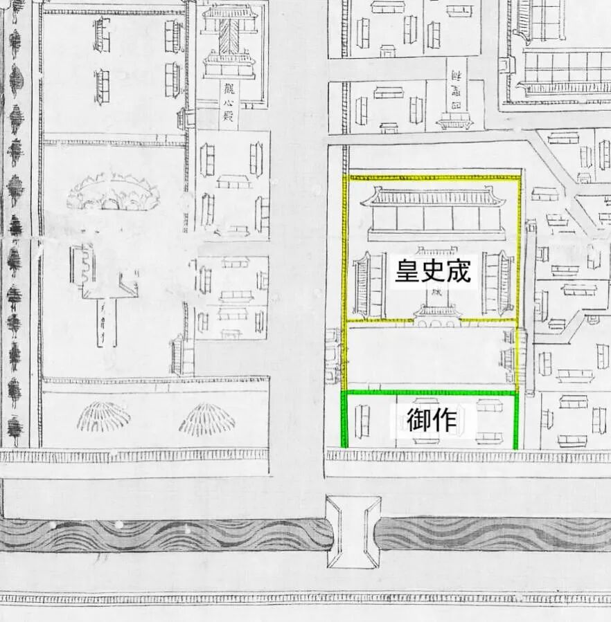 关于皇史宬及南侧院落情况,按康熙朝《皇城宫殿衙署图》(以下简称《衙署图》)所示,在皇史宬南墙外,菖蒲河北岸确有一处院落,与皇史宬南院共用同一堵墙。检索已有研究,此图应绘于康熙八年(1669年)底,上距明清鼎革仅20余年。兼之此处并非紧要之处,其街巷院落的布局应与明末情况相去无多,大致可视作嘉靖朝皇史宬初建后的周界情况。❖ 台北故宫博物院藏清康熙朝《皇城宫殿衙署图》(局部)