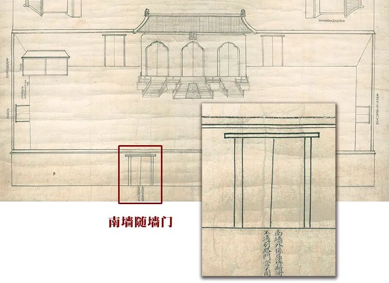 《皇史宬全图》的成图时间,据笔者考证应在乾隆十二年(1747年)至十五年之间,原藏清宫造办处。该图详细描摹乾隆朝初期皇史宬建筑群,尤其正殿内的陈设情况。图中所绘南院部分,有值房一座,东西两端各有琉璃门一座。南墙中间偏西位置,开随墙琉璃门一座,与现今修缮时所发现的情况吻合。在该门位置处,图上另有注释文字:“南墙外系库资胡同,不通别路,门常不开。”从现存门扇、门楣及门簪安装情况看,此座琉璃门系由外向内开,也即自现今的墙外一侧向南院内部开启。其形制式样,应与紫禁城内各类似院落的随墙琉璃门相仿,只是在装饰等级及繁复程度上,或有些许差别。依目前情况看,门楣之上或为无琉璃装饰的素挂檐,门框两侧直接接砖墙,并未加装石料。但相对于更为朴素些的随墙门,因为加装了门簪,从建筑等级上讲,还是有所区别。综合而言,约为寿康宫区域南侧两座随墙门的取中情况。❖ 故宫博物院寿康宫区域南侧的随墙门(摄影:故宫博物院古建部 朴世禺)