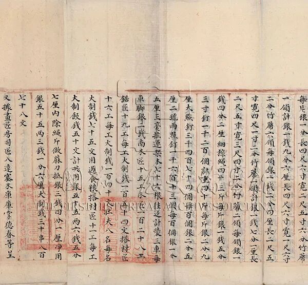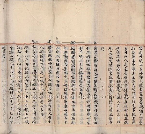 嘉庆三年(1798年),内务府奉宸苑一干工匠杂役养护内廷花木时,御花园有梅花罩一座,其规制为“通面宽二丈四尺,分三堂,进深三尺五寸,连顶高七尺四寸”。宁寿宫有梅花罩5座,其中的两座较小,“高四尺五寸见方,三尺五寸头停,四面斜深一尺四寸”,一座较高大,“通高一丈二尺见方,八尺头停,四面斜深二尺四寸”,另二座则是“通高一丈一尺见方,七尺五寸头停,四面斜深一尺五寸”。这5座梅花罩“俱四面花窗心,前面随门子押定竹席,满挂毡里”。作为清帝主要起居地的养心殿,建有梅坞,其中搭建的梅花罩棚分外精致:“外口见方五尺三寸,通高八尺七寸,内披水顶高一尺五寸,上檐见方三尺八寸,四面站拍,前面随门口高五尺宽二尺一寸,外面灯笼框花条押定花竹席,内衬引板,里面挂毡里。”❖ 内务府营造司为核查御花园等处搭盖梅花罩等项应用匠役银两事呈稿在一些档案中,还提到西苑南花园虽然没有梅花罩,但也有众多梅花,为了“前后遮盖香片梅并各样花卉”,年例需搭盖天棚3座。这里难得地记载了一处细节,即南花园的主要梅花品种是香片梅,可与高士奇《金鳌退食笔记》相参照:“每岁正月进梅花,十一月十二月进早梅、蜡瓣梅,又有香片梅,古干槎牙,开红白二色,安放懋勤殿。”又见《清稗类钞》:“香片梅之种出会稽,御题王冕画梅诗,以名花新品,蒙入奎章藻咏,实可补群芳之所未备也。”可见香片梅应为江南进贡的名贵品种,曾得皇帝御笔品题。❖ 嘉庆朝缂丝岁朝图·故宫博物院藏