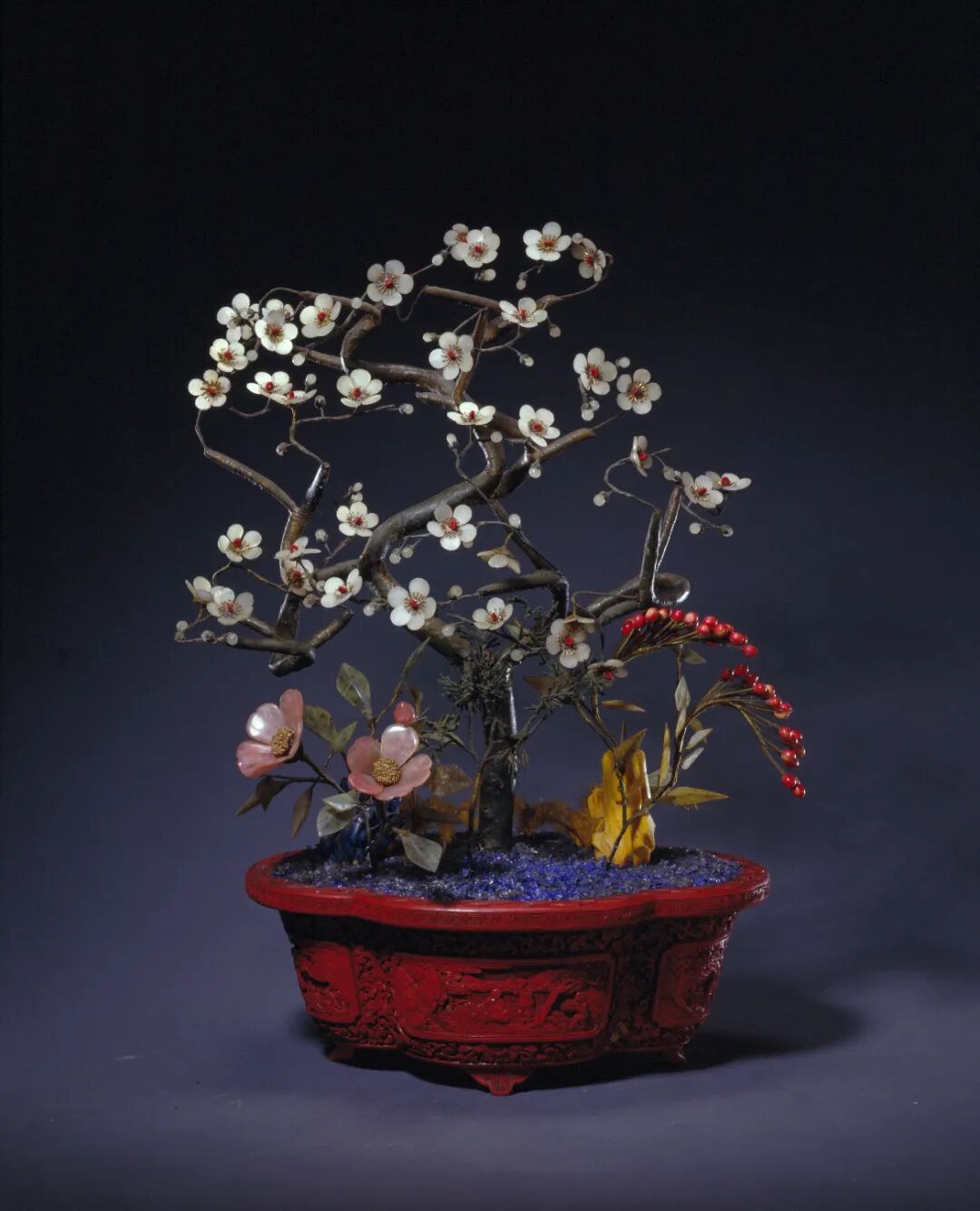 其实,平山堂原为欧阳修任扬州太守时所建,以修竹深池、凭栏风景为盛,与同在南巡路线上的苏州邓尉、杭州孤山相比,平山堂梅花并不出名。但扬州是乾隆帝驻跸江南的首站,在这里,他领略了“平山万树发新花”的美景。在这首诗的注解中,他写道:“平山向无梅。兹因南巡,盐商捐资种万树,既资清赏兼利贫民,故不禁也。”是南巡之举为平山堂增添了新的风雅景观,既可承继古人流风遗韵,又能造福当地百姓,言下不免有几分自得之意。乾隆帝爱梅赏梅,亦咏梅画梅,从存世的诗作画作观之,达到了一定的艺术境界。他称许“梅花品格最胜,冰姿玉骨,铁干古心,迥非凡卉之匹”,可谓梅之知音。❖ 剔红海棠式盆玉石梅花盆景·故宫博物院藏