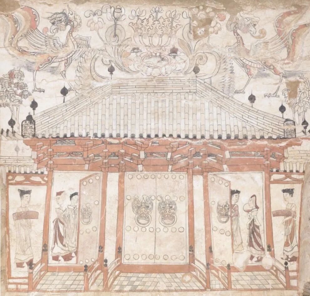 九元岗墓壁画的内容不止于此。除了“升天图”,还有将“界画”概念推前上百年,让人认识到唐代之前的建筑模样的“门楼图”: