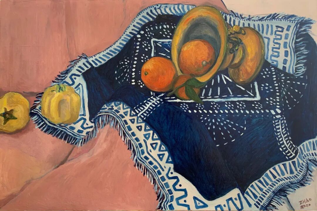 赵抑抑 :最近画这些静物,是因为比请模特便宜,而且它们纹丝不动,从水果变成干果。马蒂斯影响了我的构图,看他的画给予我热情;塞尚让看到绘画可以是另一种样子,我被他的画感动,我喜欢他们作品中的绘画性。