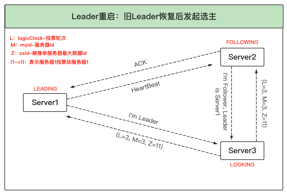 之前宕机的旧Leader恢复正常后,进入LOOKING状态并发起新一轮领导选举,并将选票投给自己。此时服务器1会将自己的LEADING状态及选票返回给服务器3,而服务器2将自己的FOLLOWING状态及选票返回给服务器3。