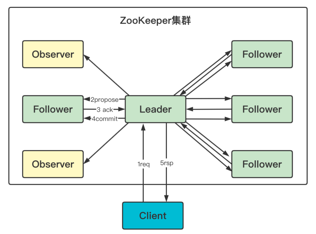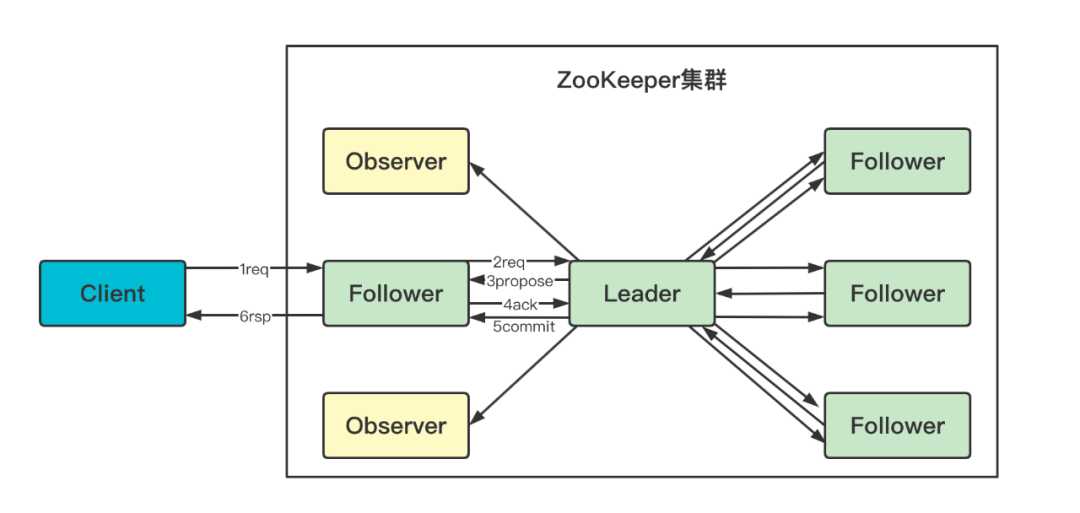 Follower可接受写请求,但不能直接处理,而需要将写请求转发给Leader处理。
