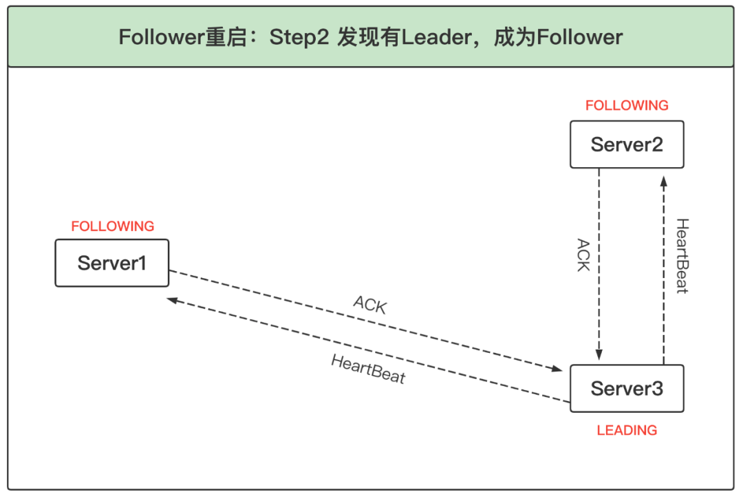 根据上述选票,三个服务器一致认为此时Server3应该是Leader。因此Server1和Server2都进入FOLLOWING状态,而Server3进入LEADING状态。之后Leader发起并维护与Follower间的心跳。