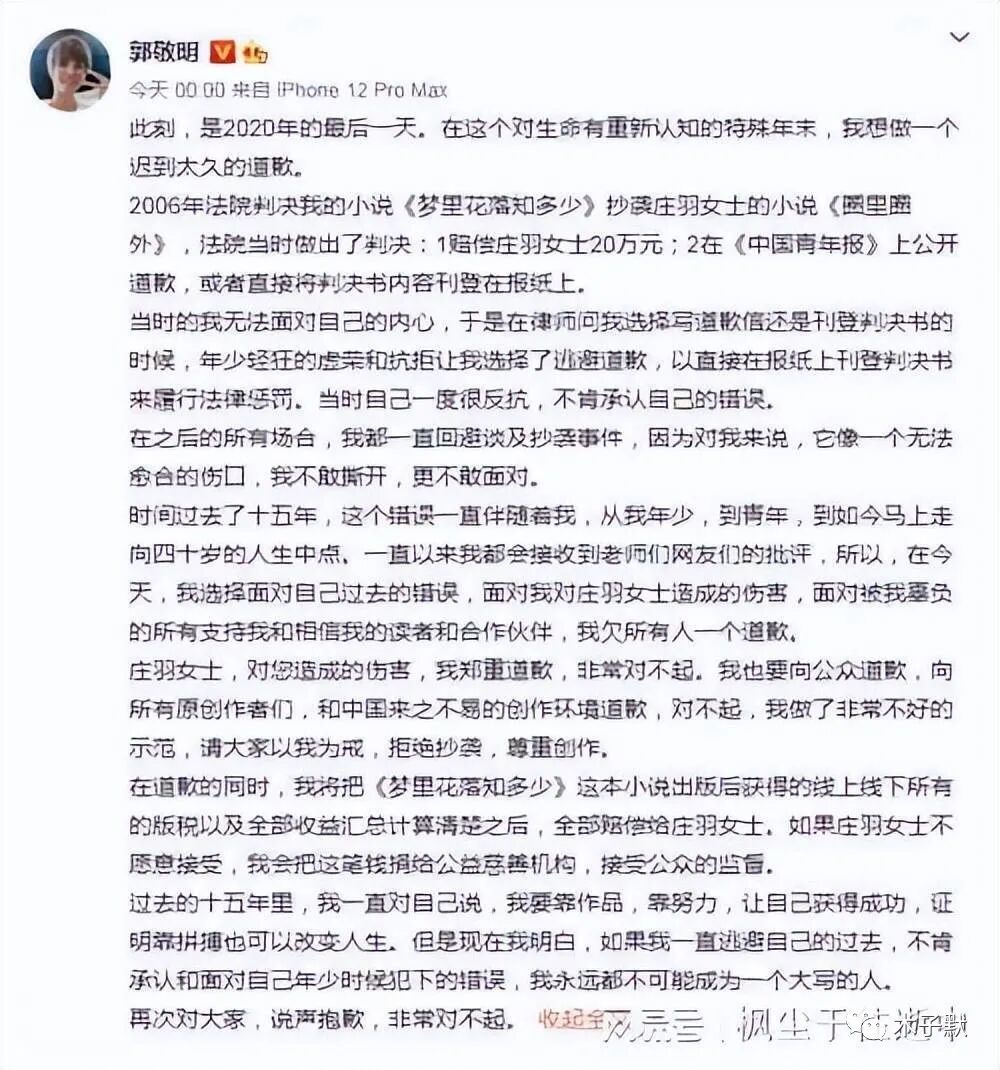 当年庄羽起诉郭敬明的作品《梦里花落知多少》抄袭她的作品《圈里圈外》闹得沸沸扬扬,顶着天才偶像作家头衔的郭敬明在一审败诉后,依旧不肯低头道歉,选择了上诉,二审仍维持原判,郭敬明坐实了抄袭一事,但是郭敬明在之后从未提及自己抄袭一事。