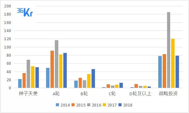 36氪整理了2014-2018年医药赛道的投融资事件数据。我们看到,2014年和2015年,融资事件数仅为171个和254个;而2016年起赛道骤然升温,2016年融资事件数达到顶峰,共有401个;尽管资本寒冬来临,2017年、2018年的数据也没有大幅降低,分别为302个和279个,基本保持平稳。