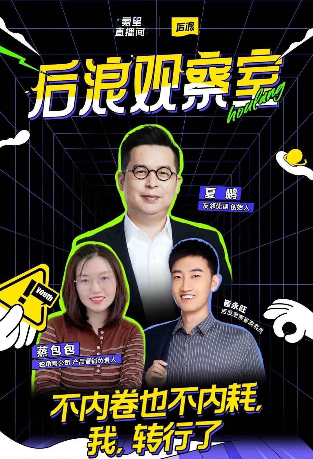 这一次,“后浪研究所”的直播栏目“后浪观察室”邀请到友邻优课创始人夏鹏、某独角兽公司产品营销负责人蒸包包,一起探讨转行这件事。他们都是转行实践者:夏鹏2007年毕业后在新东方工作了8年,之后开启创业,如今又做起了视频博主;蒸包包从英语专业后,在美国硅谷成为了一名程序员,回国之后又陆续尝试在企业服务等领域做起了产品营销。