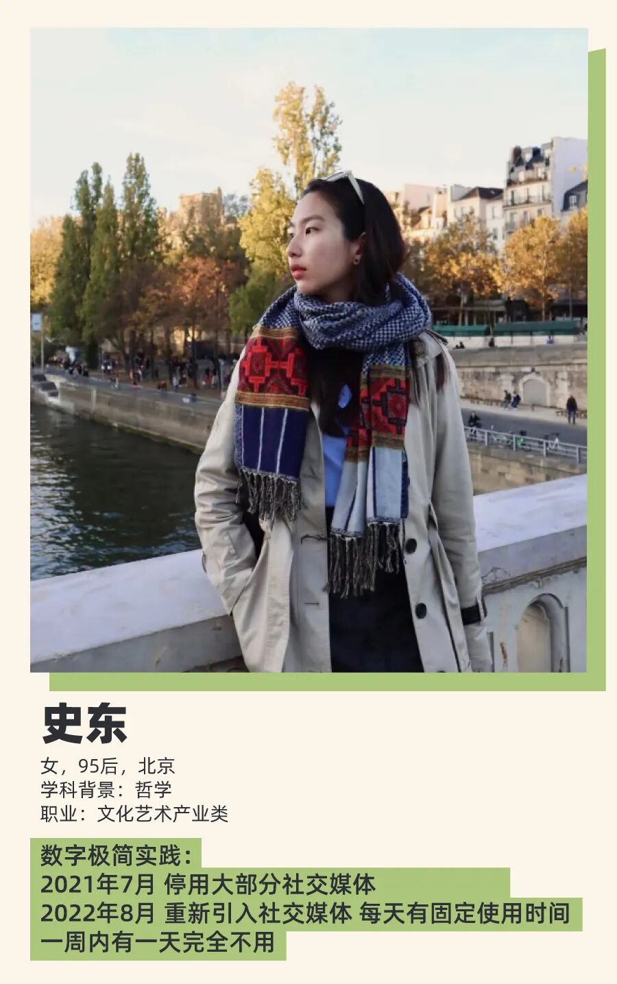 我第一次听说“数字极简”这个概念,是我大一在英国UCL读哲学的时候,过程非常有趣。当时我们在教学楼做小组讨论,提议把所有人加到一个Facebook群组里面。有个同学就说“我没有Facebook”。我问他“你有别的东西吗?WhatsApp之类的”,结果他什么社交媒体都没有,只说可以把电话号码给我。那是我第一次见到不用社交媒体的同龄人。真正开始熟悉这个概念,是在2018年,我去比利时的布鲁塞尔过圣诞节。回英国的火车上,我隔壁坐着一个金头发的英国男生,戴着细框眼镜,长得特别“英国”,就在那儿静静看书,他在剑桥大学读哲学系。后来我们俩就聊起来了,聊最近看什么书,生活有什么改变。他就说最近把他的智慧型手机给“扔”了,手上还拿着一个翻盖手机,特别老的那种。火车到站的时候,我们约好下次在剑桥一起吃饭,一起参加研讨会。他从西装外套的口袋里掏出一支铅笔,一叠便条纸,让我写了我的Email,说回头跟我联络。后来还真就给我传了Email!邀请我去剑桥参加研讨会。