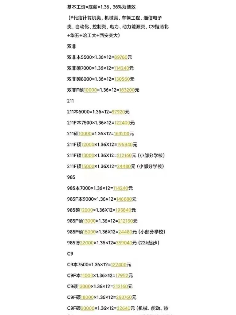 此前多个网络平台流传的一份比亚迪校招薪资登记表也印证了郭宇的说法。应届生薪资被分为4档21类,这4档包括双非、211院校、985院校及C9院校,每档按照本科、本科F专业、硕士、硕士F专业等进一步细分,普通本科年基本工资为9万元左右,最高的985博士年薪可达35万元以上。