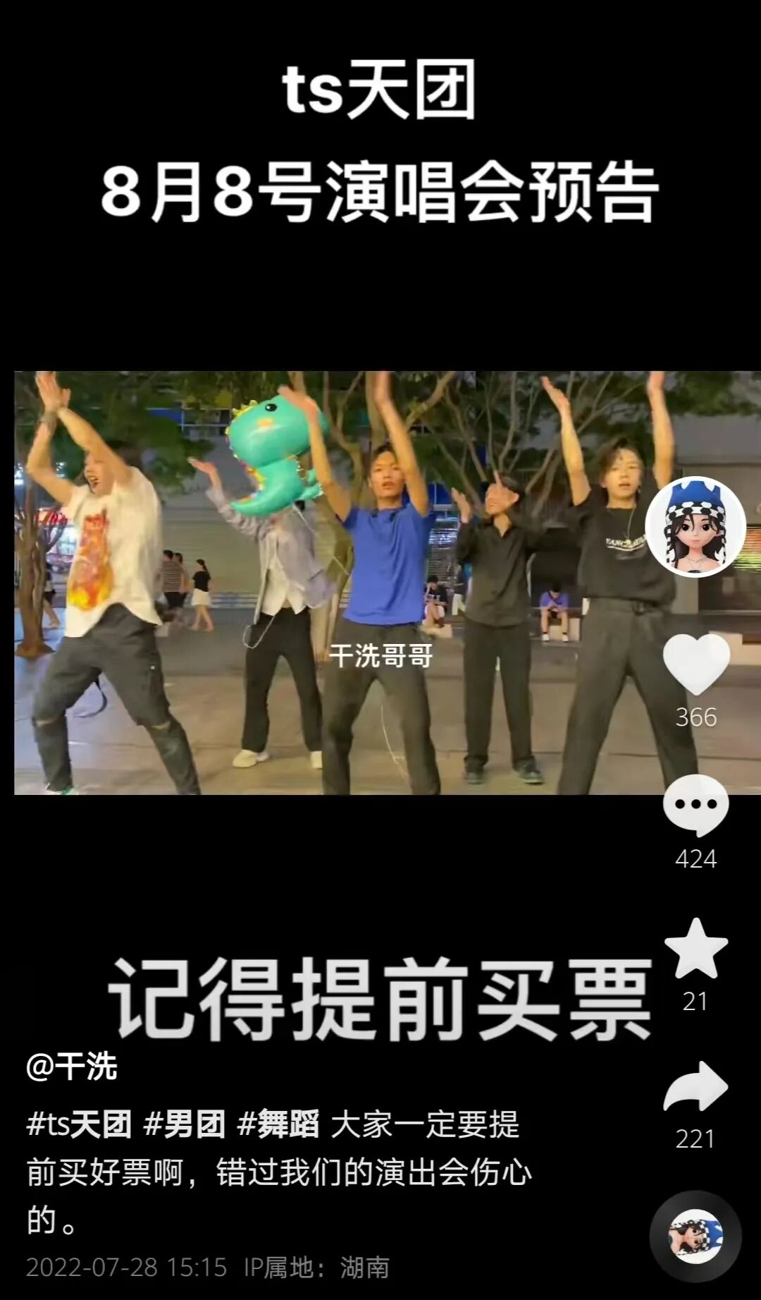 在他们组建了TS天团后,有过几次路演,表演元素与明星偶像也不沾边,主要是一些流行的韩国舞曲和内地偶像的热曲,这个团队内彼此舞蹈水平参差不齐,动作显得笨拙滑稽,发上网的视频都总会被笑话,一条跳《破风》舞蹈的视频,被人评价说“像中风了”。